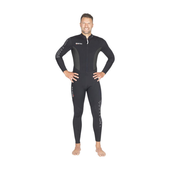 The Switch 2.5mm wetsuit for men has a front zip. There is a grip area on the wrists that allows for a better grip on diving instruments such as computers and wrist compasses.